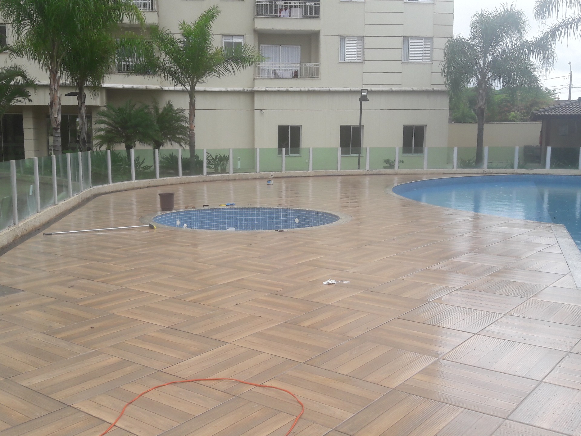Reconstrução de deck com estrutura metálica e piso porcelanato. Ed. Mirage, Vila dos Alpes, Goiânia-GO.